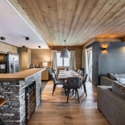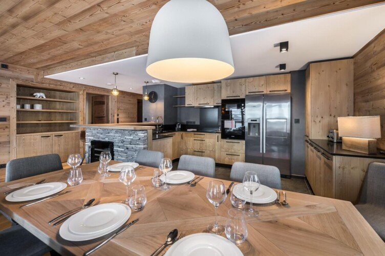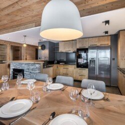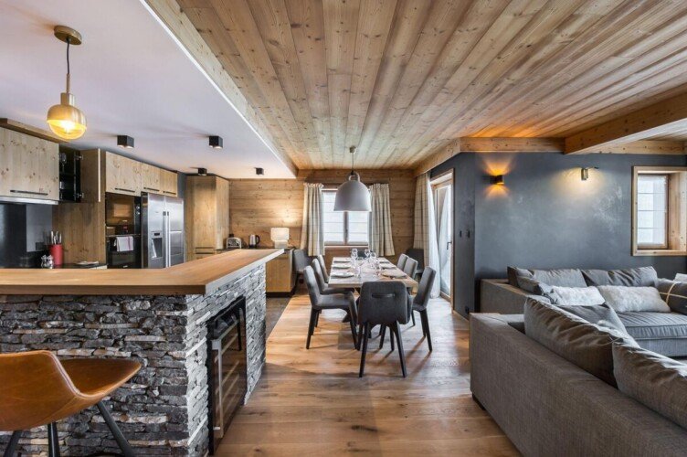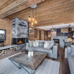 The second floor at this luxury ski chalet offers two sitting areas separated by a cosy fireplace and an open plan kitchen dining space. Luxe furnishings and wooden beams create a classic laid back, Alpine vibe.