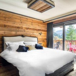 The open-plan living spaces are spacious and welcoming, presenting the perfect place to socialise and unwind after a long day on the slopes. Relax on the wide, sumptuous Chesterfield sofa and exceptional high back chair, in front of the warm fireplace, as you gaze out to the breath-taking snowy mountain views in front of you. Adjoining this space, the dining area features an imposing wooden table to host the evening’s banquet prepared by your spectacular chefs. With four comfortable armchairs surrounding the table, take a seat and enjoy some of the finest food in the Alps in complete comfort.