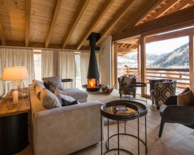 The open plan living space is cosy and welcoming with a state-of-the-art wood-burning fireplace surrounded by comfortable sofas and floor-to-ceiling windows which flood the room with natural light.