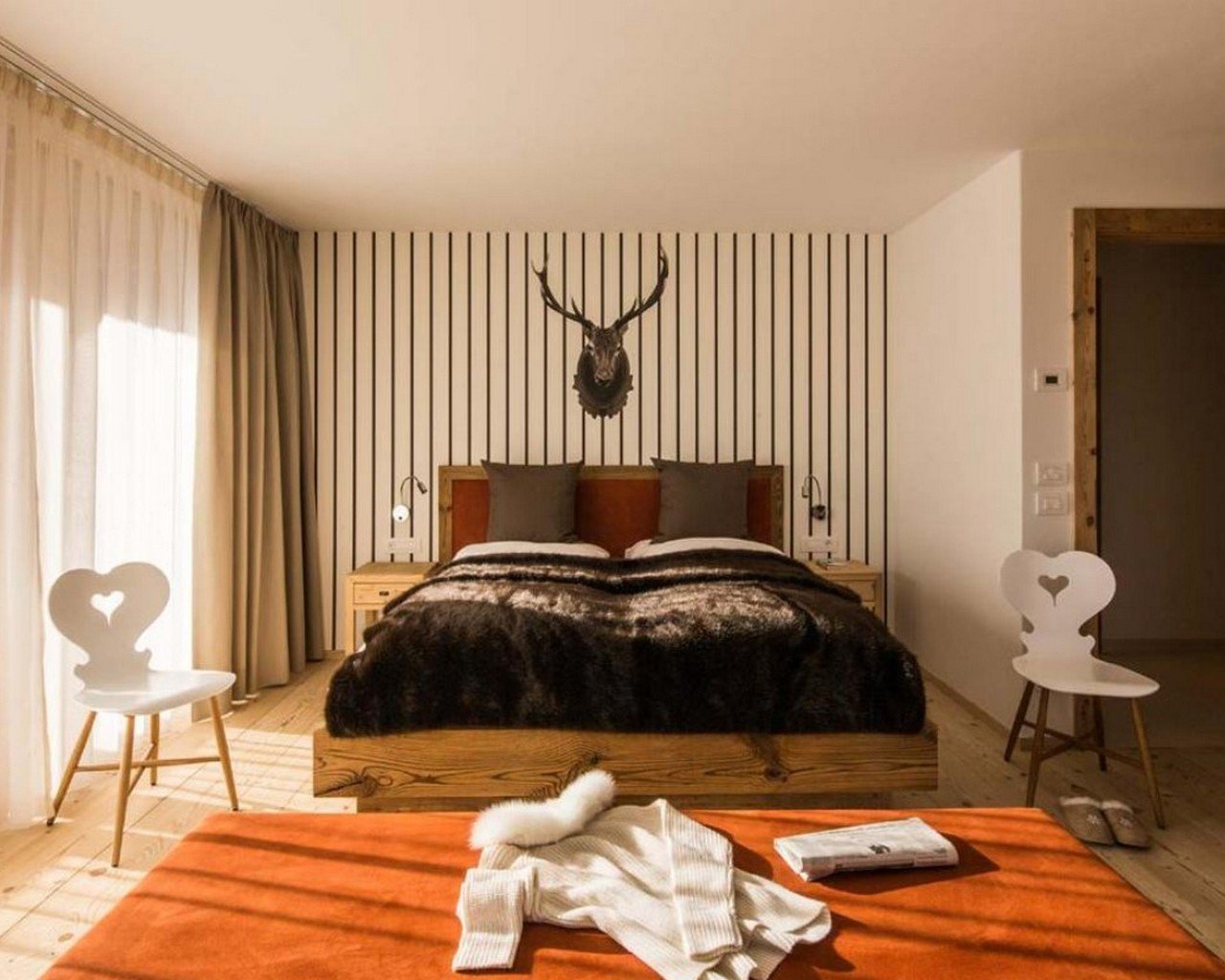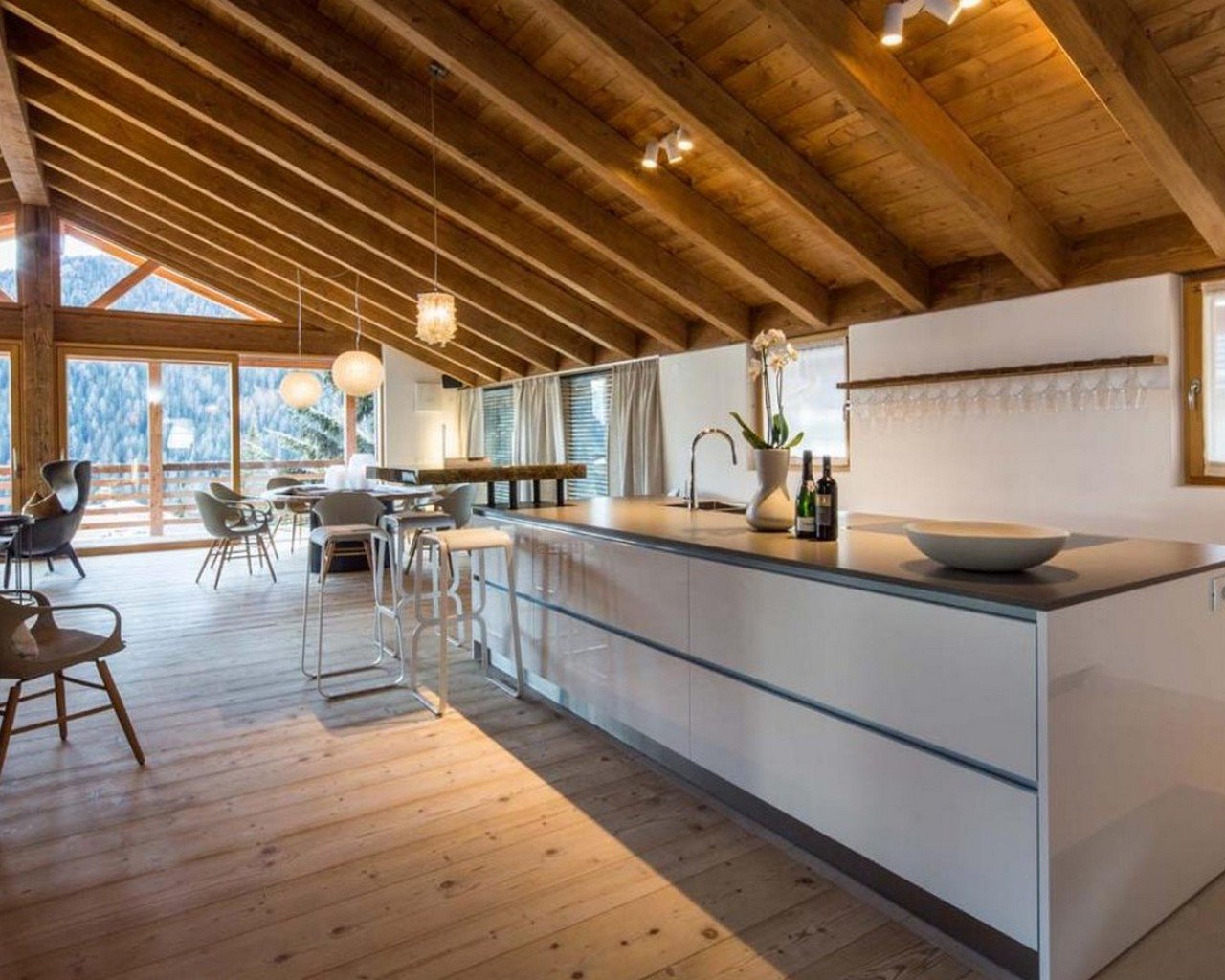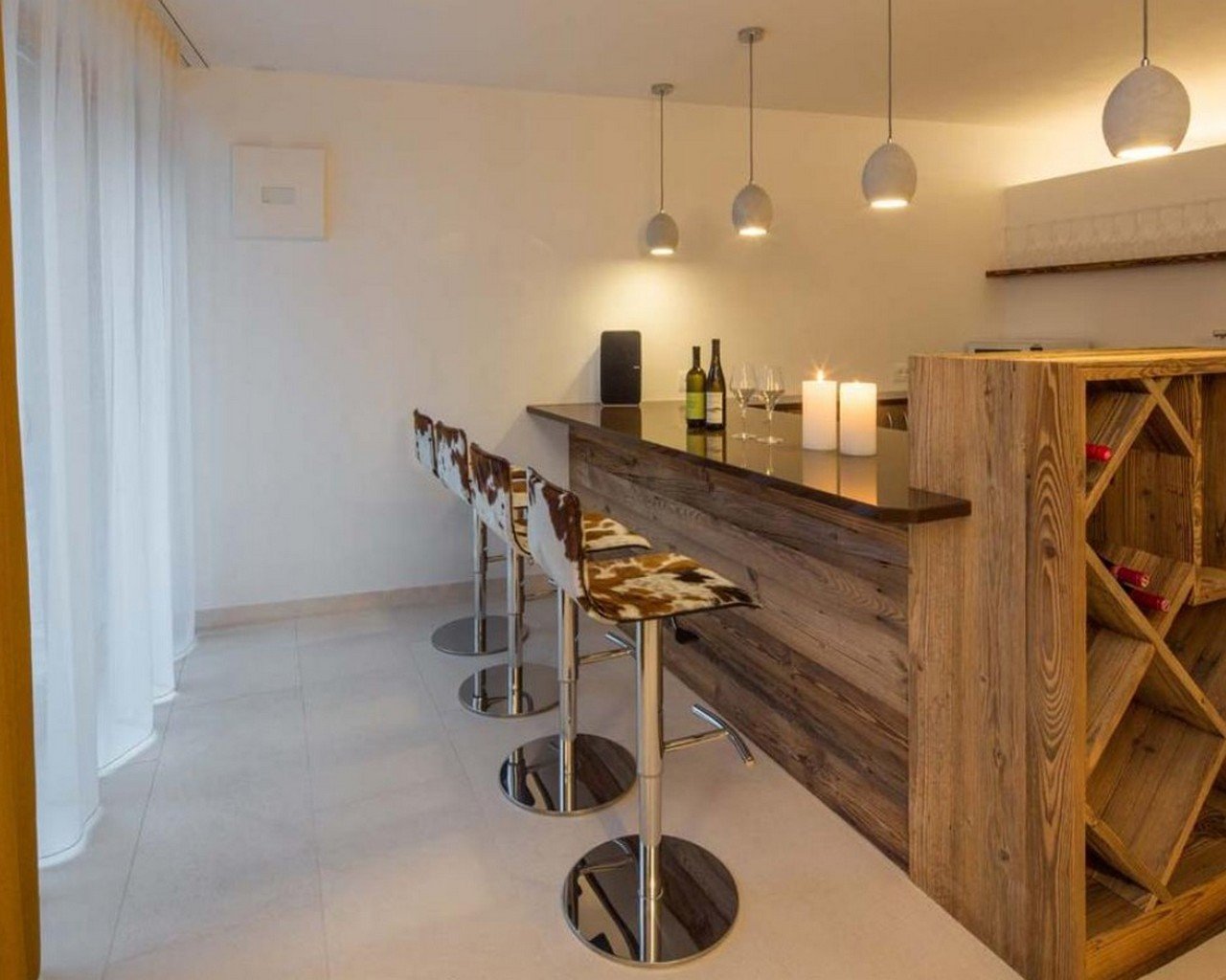 Meals can be prepared in the well-equipped kitchen and enjoyed around the locally designed dining table which seats ten. A four-seater bar provides the perfect spot for enjoying an apres-ski beverage or two. the Chalet is home to four luxurious en-suite double bedrooms, plus another double bed area with bathroom, screened from the rest of the lower level floor with an antique wooden screen.