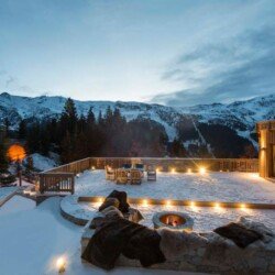Doors open onto a huge terrace equipped with a fire pit surrounded by a fur covered seating area, perfect for enjoying toasted marshmallows and hot chocolate after a day on the slopes. For added enjoyment there is also a barrel sauna and plunge pool located here, as well as an outdoor hot tub on the first floor terrace.
