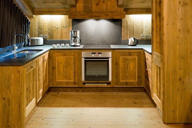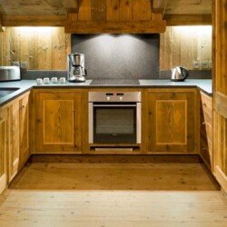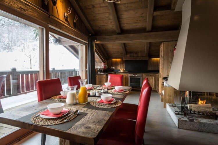 Chalet Baby Bear is a true alpine home with classic chalet structure and wooden interiors. The living area is found on the top floor of the chalet with a vaulted ceiling, exposed wood and huge central fireplace. Relax on the comfortable L-shaped sofa to the crackle of the fire, or grab a book from the small reading corner adjacent. To the other side of the fireplace, large French doors out onto the Balcony, bring in plenty of natural light and beautiful views of the snowy surroundings. The dining space, is a perfect family set up with a fully open-plan kitchen, allowing you to talk away with your cook.