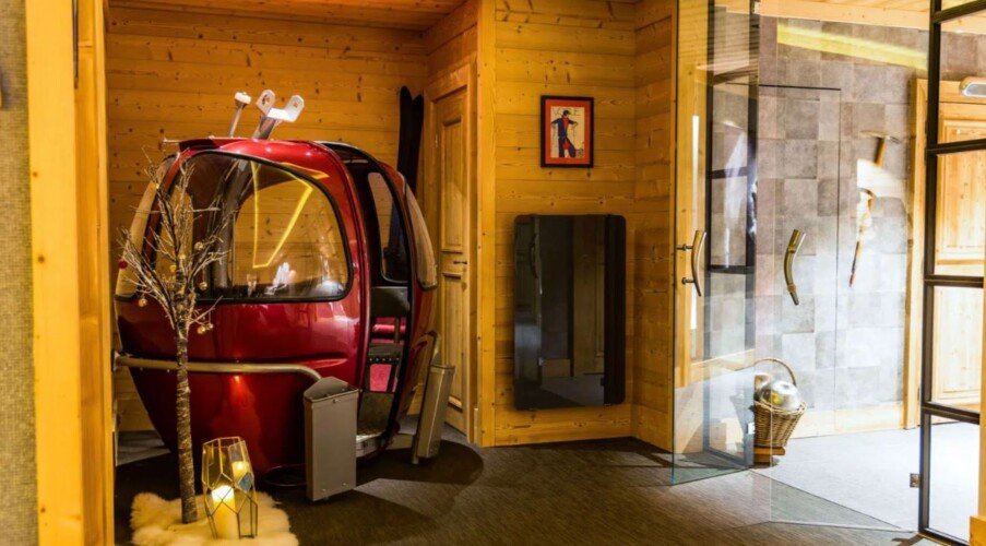 In the basement, there is a heated ski room with a boot dryer, a sauna/hammam and a table tennis area. On the ground floor, there is a massage room and three bedrooms with direct access to the terrace and nordic bath. These include a master suite with double bed, fireplace, desk and walk-in wardrobe, and two bedrooms with double or twin beds, each with en-suite facilities.