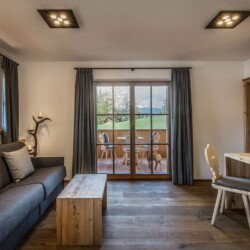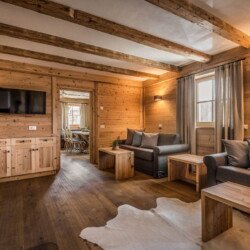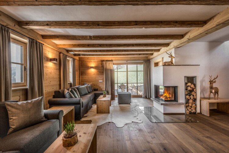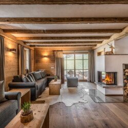 The chalet has a spacious living room with comfortable sofas and a fireplace. Doors open to a large terrace with incredible views of the Tofane, Kreuzkofel and Putia mountain ranges.