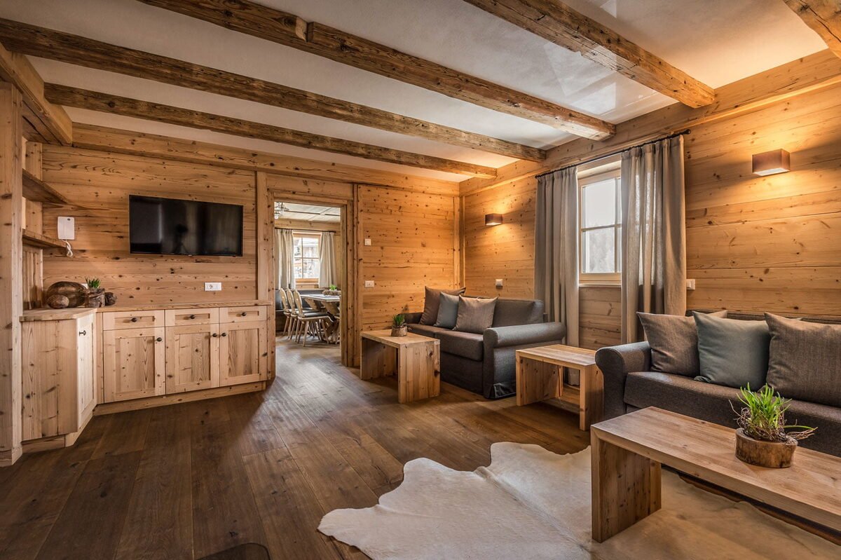 The chalet has a spacious living room with comfortable sofas and a fireplace. Doors open to a large terrace with incredible views of the Tofane, Kreuzkofel and Putia mountain ranges.