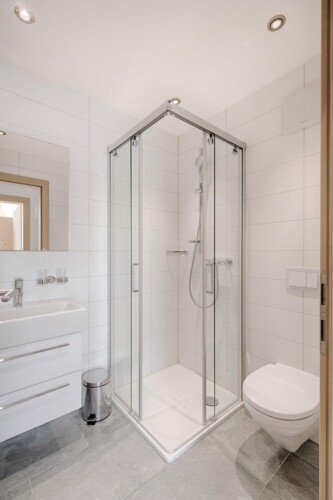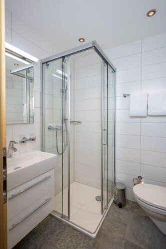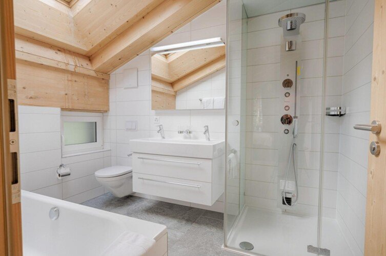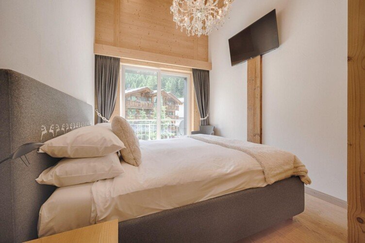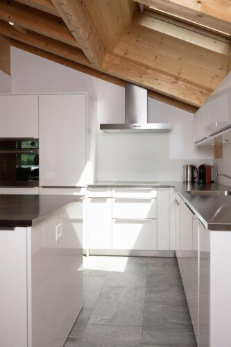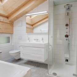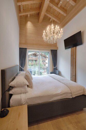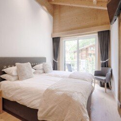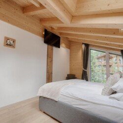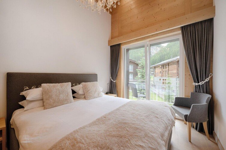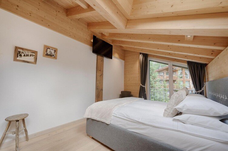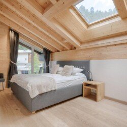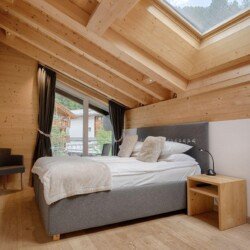 Furnished with oak wood floors, mountain spruce and modern furniture, the stylish open-plan living and dining area is the perfect spot to unwind and socialise after a day hitting the slopes of the Matterhorn Ski Paradise. A feature stone fireplace accentuates the warmth and comfort on offer at this luxury property. Tuftra Penthouse 4 has a smart modern kitchen which you can make use of or you can explore the culinary delights of the fabulous restaurants that Zermatt has to offer. A balcony off this space is a great place to enjoy an evening aperitif and take in the gorgeous panoramas of the mountains and forest.