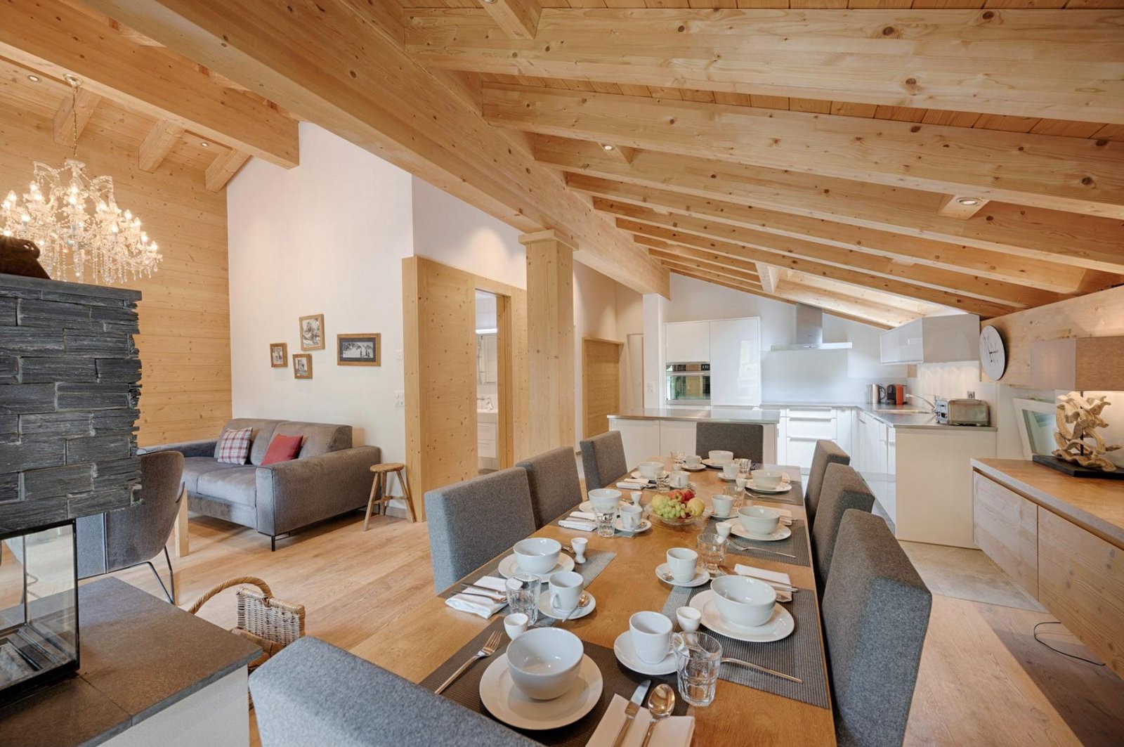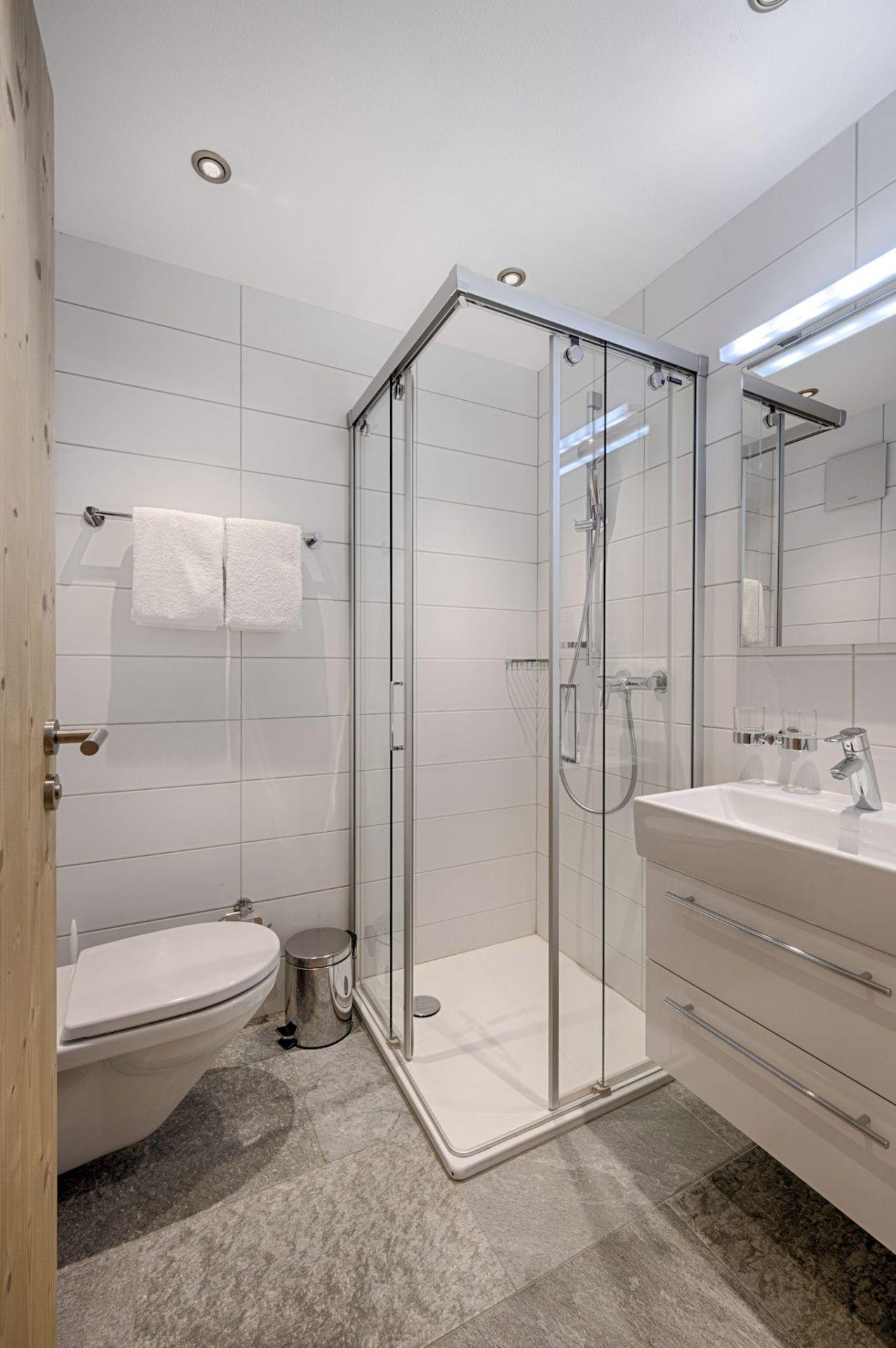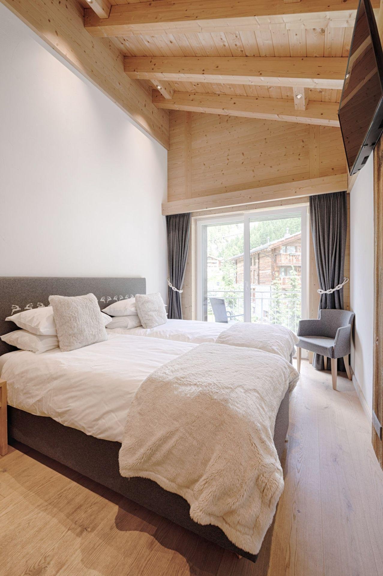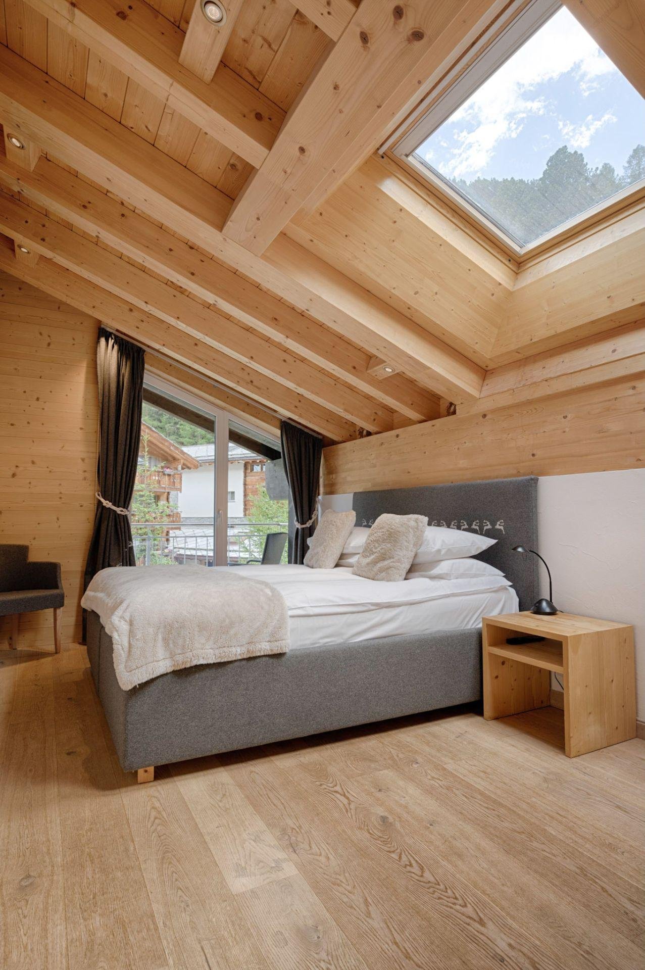 Furnished with oak wood floors, mountain spruce and modern furniture, the stylish open-plan living and dining area is the perfect spot to unwind and socialise after a day hitting the slopes of the Matterhorn Ski Paradise. A feature stone fireplace accentuates the warmth and comfort on offer at this luxury property. Tuftra Penthouse 4 has a smart modern kitchen which you can make use of or you can explore the culinary delights of the fabulous restaurants that Zermatt has to offer. A balcony off this space is a great place to enjoy an evening aperitif and take in the gorgeous panoramas of the mountains and forest.